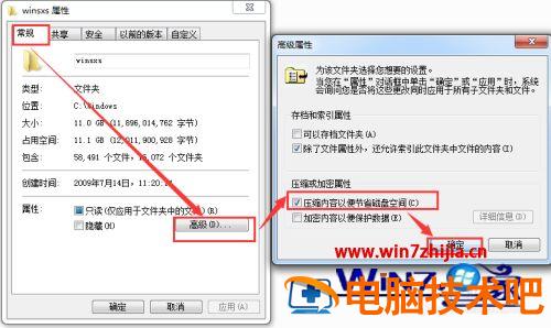 9、最后就是点击弹出的窗口中的【常规】下的【高级】按钮,再勾选【压缩内容以便节省磁盘空间】,再点击【确认】按钮就可以完成所有操作。