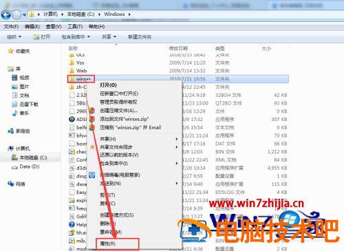 8、然后就是在【C:\Windows】中找到【winsxs】文件夹,并右击,选择【属性】选项。