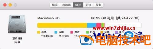 5、点击顶部的【存储】栏目,可以查看当前苹果电脑配置的硬盘存储容量大小,还可以看到当前的一个内容占用情况。