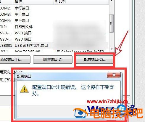 4、点击“配置端口”按钮,弹出“这个操作不支持”的错误提示,说明这台打印机是没有IP地址的。