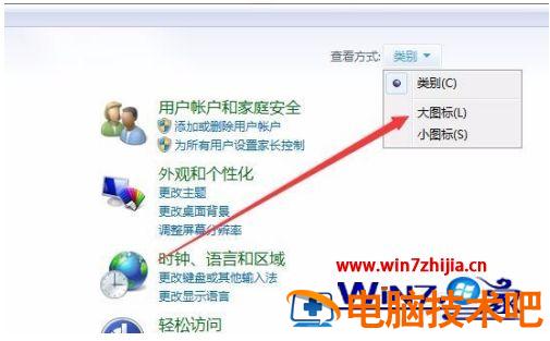 2、在打开的控制面板窗口中,点击右上角的查看方式下拉按钮,在弹出菜单中选择“大图标”菜单项。