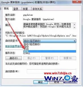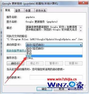 6、双击Google更新服务(Gupdate)项,在打开的窗口中点击启动类型下拉菜单,在弹出菜单中选择“禁用”菜单项,然后点击确定按钮。