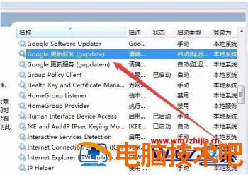 5、在打开的服务窗口中,在右侧服务中找到“Google更新服务(Gupdate)”服务 项与“Google更新服务(Gupdatem)”服务项。