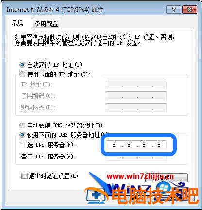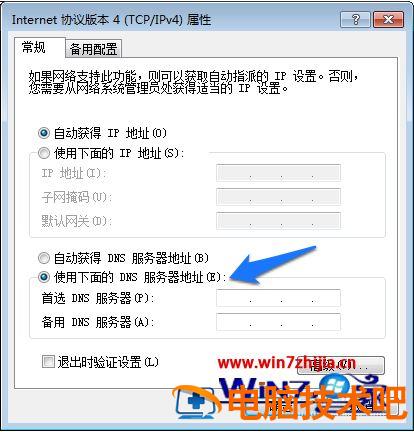 7、在 “TCP/IPV4”属性中,为当前网卡手动配置一个 DNS 服务器地址,选择“使用下面的 DNS 服务器地址”选项,如图所示。