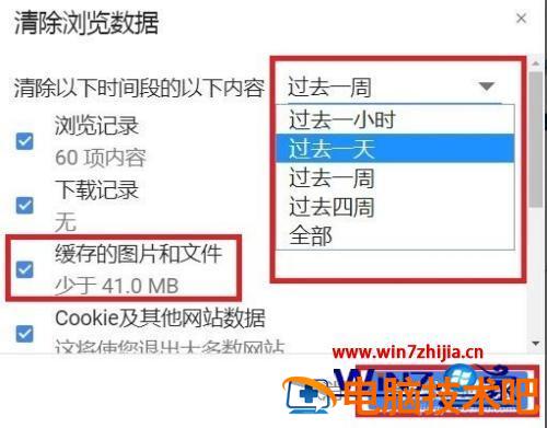 4、选中“清空缓存”,在“清除这y段时间的数据”后面的下拉列表中选择“所有内容”,点击“清除浏览数据”按钮。如果“清空缓存”后问题仍然存在,可以尝试清除其它数据。