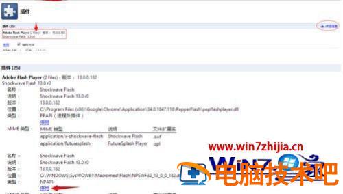2、禁用掉一个flash插件,在地址栏中输入chrome://plugins,找到Adobe Flash Player这个插件,旁边括号中写的(2files),点击右边的详细信息,把其中的一个禁用掉,只留一个flash插件,建议禁用chrome自带的flash插件。