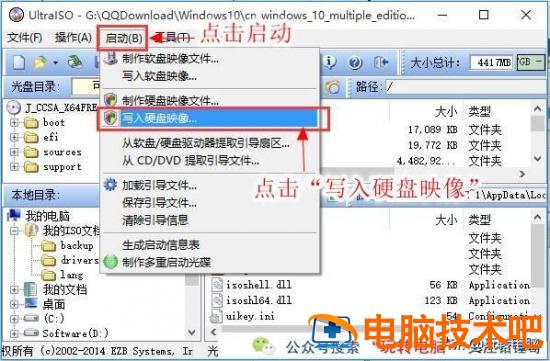 然后再回来UltraISO窗口,依次点击菜单栏中的启动和写硬盘镜像