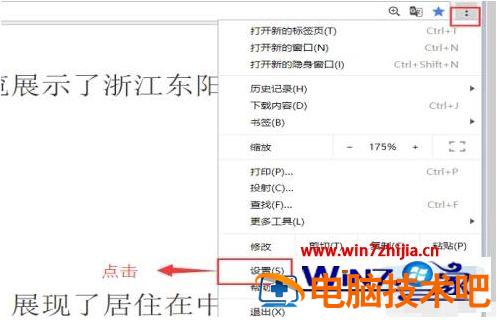 1、点击谷歌Chrome浏览器地址栏最右边的选项按钮,然后选择设置,见下图: