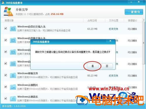 8、点击按钮后,弹出一个是否创建还原点的询问框。为了以防万一,避免删除后出现意外故障的情况,我建议大家选择【是】来创建一个还原点。