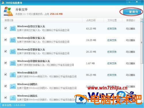 5、在瘦身窗口中,软件会自动检测系统盘可以清理的文件,然后显示在下方的列表中。