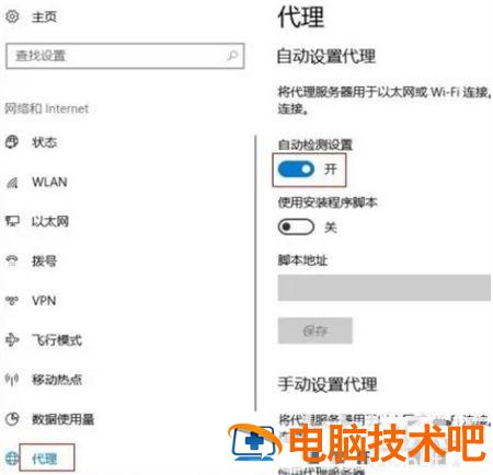 3.在网络和Internet界面,点击左侧代理进入并将自动检测设置开关打开即可。