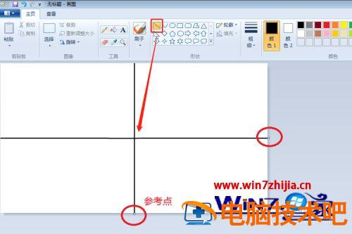 2、然后,画十字交叉线,将图纸均分为四份。调整直线位置时,利用参考点,通过键盘上的上下左右键进行微调。