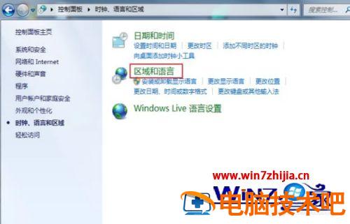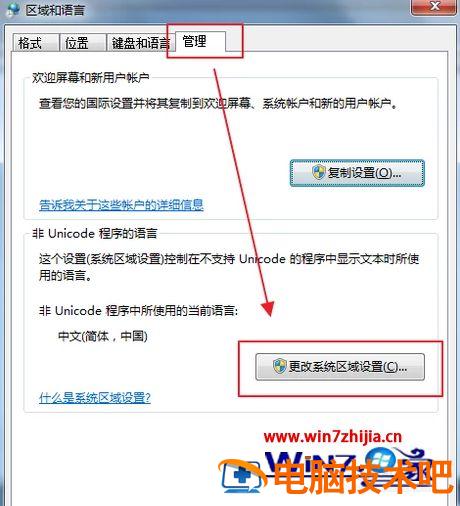 4、在“区域与语言的”设置栏里点击“管理”,然后点击“更改系统区域设置”。