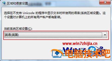 5、将“当前系统区域设置”设置成“英语(英国)”,然后点击确定按钮,重启电脑。