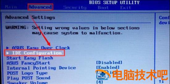 1、在进入到开机启动的页面时,按f2进入bios主界面后,按方向键找到【advanced】,再进入的子菜单中使用方向键选择【ide configuration】按回车打开启动设置。