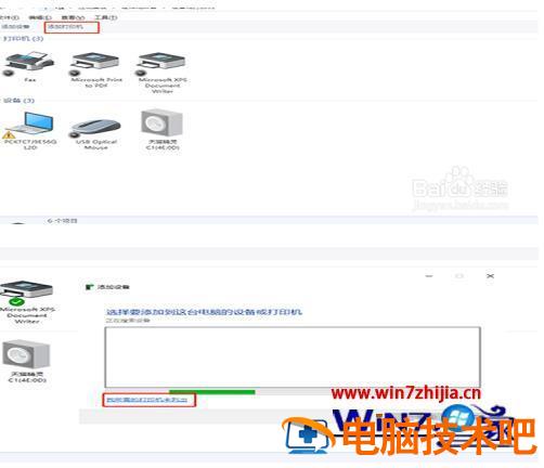 6、进入设备和打印机的主界面,在顶部找到“添加打印机”,在弹出的搜索界面里,点击“我找的打印机未列出”。