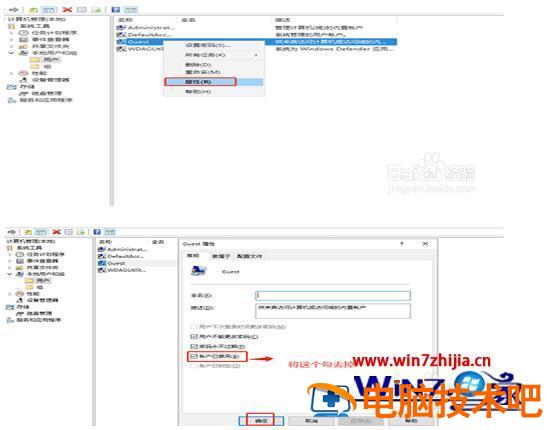 4、选择了Guest之后,右键单击选择“属性”,进入属性窗口中,找到“账户已禁用”,这个选项默认是打上勾的,我们将这个勾去掉。