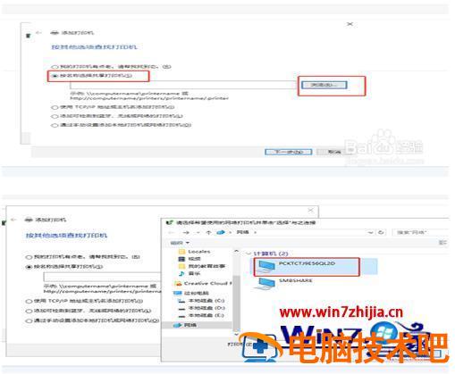 7、选择按“按名称选择打印机”,点击右边的“浏览”,这时候会发现周边的电脑,点击连接着打印机的电脑,选择电脑里面的打印机即可。