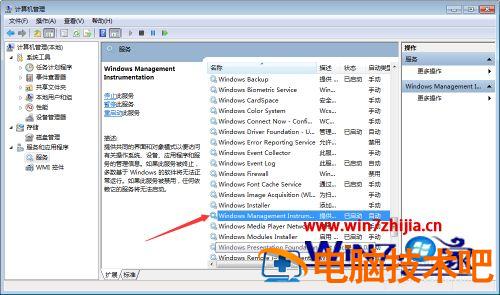 4、再找到“Windows Management Instrumentation”右击-“重新启动”(如果重新启动是灰色,则右击后点“属性”-启动类型里选“自动”-再点“启动”然后“确定”)。