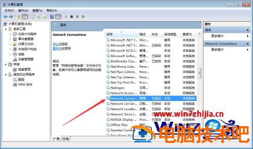 3、在右侧找到“Network Connections”右击-“重新启动”(如果重新启动是灰色,则右击后点“属性”-启动类型里选“自动”-再点“启动”然后点“确定”)。