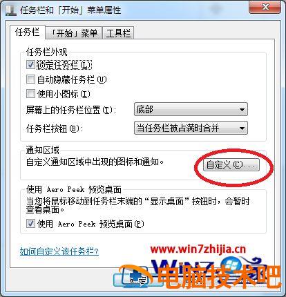 2、弹出任务栏属性,找到通知区域下的“自定义”。