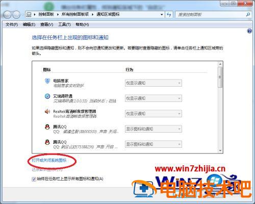 3、在通知区域对话框找到“打开或关闭系统图标”。
