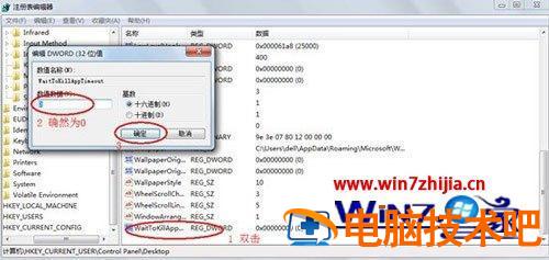 3、按照这个顺序来打开win7需要编辑的注册表:HKEY_CURRENT_USER\Control Panel\Desktop,在Desktop文件夹的右侧空白处新建一个“DWORD 32位值”并且改名为“WaitToKillAppTimeout”,之后把数值修改到0之后保存退出就可以了。