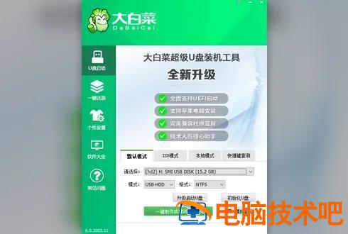 1.下载并安装大白菜装机版,打开软件,插入U盘,选择默认模式USB-HDD”,格式选择“NTFS”