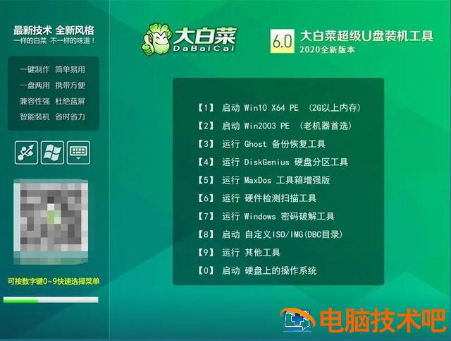 进入大白菜主菜单后,通过↑↓按键选择1启动Win10 X64PE(2G以上内存)后回车确认,成功进入winpe。