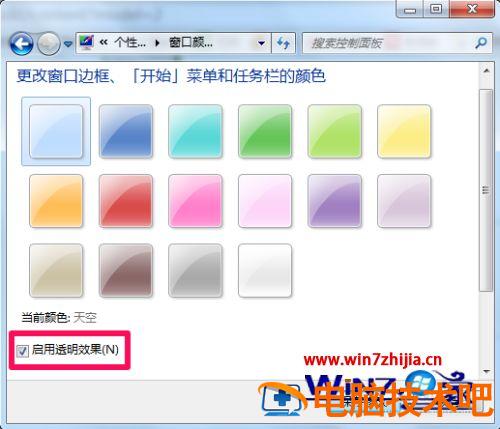 3、在窗口颜色和外观中点击勾选启用透明效果,这时win7任务栏透明就设置好了。