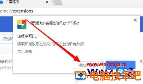 5、把我们前面下载的谷歌访问助手文件拖动到谷歌浏览器的窗口,会弹出要添加谷歌访问助手的提示,点击添加扩展程序的按钮就可以了。