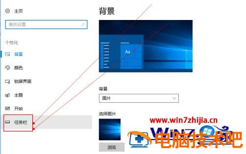 4、在打开的页面中点击左侧的 任务栏 选项;也可以在任务栏空白的地方鼠标右键,在出行的菜单中点击 任务栏设置 选项。