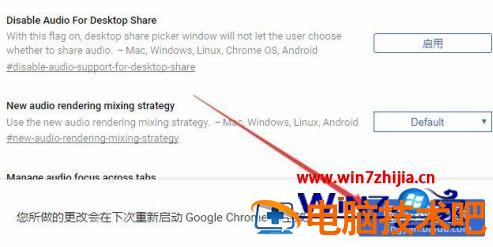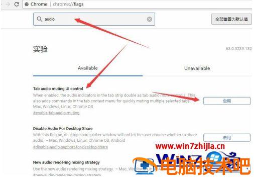 2、接着在打开的浏览器设置页面中,我们在搜索框中输入audio,可以看到“Tab audio muting UI control”的设置项,我们点击该设置项后面的“启用”按钮。