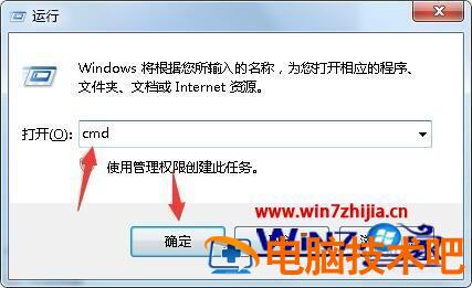 2、在运行窗口中输入cmd并点击确定进入管理员界面。