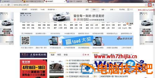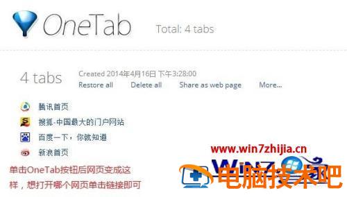 4、当你打开的标签页过多时,只需轻轻一点右面“OneTab”扩展按钮,这时就会节省约95%的内存占用。