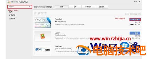 2、在搜索框里搜索“OneTab”,然后单击“+免费”按钮进行安装。