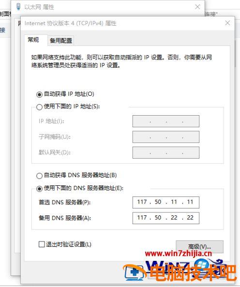 4、在下方使用下面的DNS地址中填入首选117.50.11.11备用117.50.22.22后确定即可。