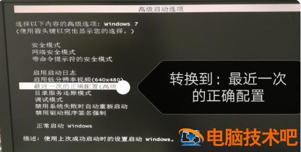 2、转换到“最近一次的正确配置”回车,即可解决这个问题。