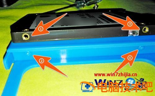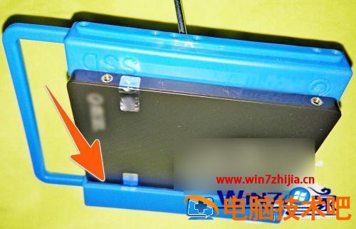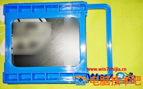 2、因为这次是要在台式电脑上加装固态硬盘,所以需要用到一起配送的那个支架,先把固态硬盘的孔位与支架里面的卡钉比对好位置,否则易造成支架与SSD硬盘安装不到位。