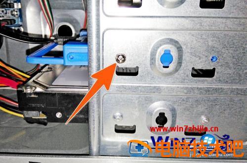 6、然后就可以把固态硬盘在台式机箱里面,找好一个硬盘位置,嵌进去,再在机箱硬盘位的两面,都一一拧上螺丝固定起来。