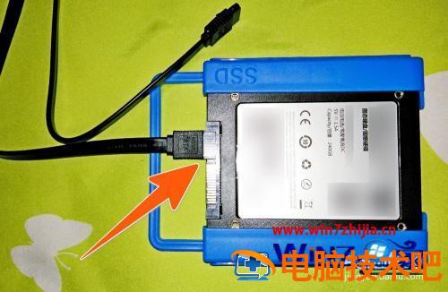 5、接着再把数据线拿出来,把数据线插上固态硬盘上面那个较窄的接头上,插的时候,要留意数据线上的那个小缺口与固态硬盘上的凸条相吻合,这样才可插上去。
