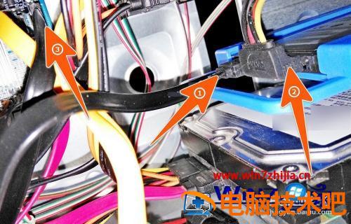 7、把固态硬盘固定在机箱上后,就再把数据线和电源线插上去,电源线是下图中箭头2所指的那个,数据线的另一头插上主板上的SATA接口,最好是那个原生的sata3.0接口。