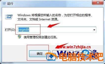 2、打开运行选项,在运行输入框中输入命令““regedit”,并点击确定按钮。