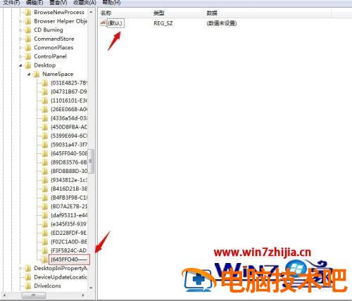 5、新建一个”项“后,我们会看左边会出现一个命名为“新建#1”的文件夹,接着我们做的是,把“新建#1”的文件夹名字改成““{645FFO40——5081——101B——9F08——00AA002F954E}”数值,改好后我们会发现在右侧也会出现“默认”字样。