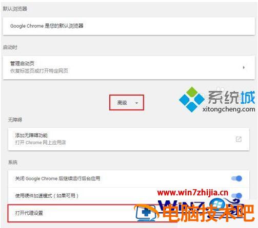 3、拖动到最后点击高级-打开代理设置。