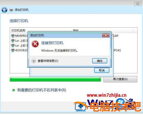 3、然后依据以下顺序操作“开始”菜单——设置——打印机和传真——添加打印机找见网络打印机如“MV0PRCRK0GW0LT2上的CannonLBP” 双击提示“windows无法连接到打印机”。