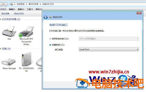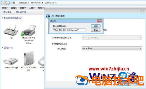 5、返回添加打印机界面,选择“创建新端口”,端口类型”Local Port”,输入端口名(即被共享的的计算机ip地址或计算机名:如:\\192.168.101.158\CannonLBP)。