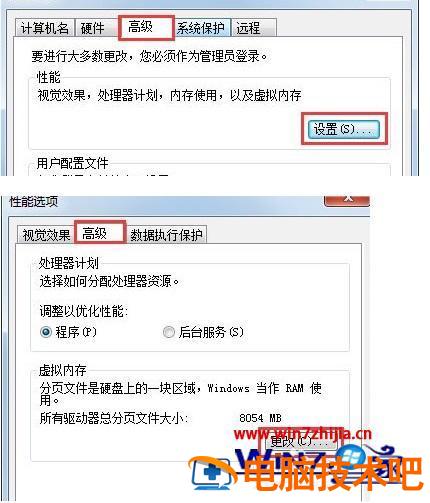 5、在打开后的“高级系统设置”中,选择“高级”下的“设置”,单击一下,然后在点击一下“设置”下的“更改”;