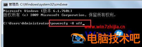 3、在打开的管理员身份编辑页面,输入“powercfg -H off”,它的意思是,关闭休眠的文件,这样C盘空间就会多出很多的;