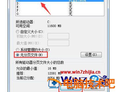6、在出现的窗口中,找到“无分页文件”,并用鼠标在前面的圆圈中打上勾,单击一下下方的“确定”选项;
